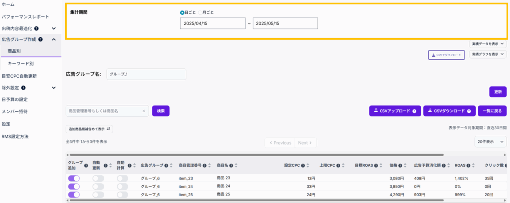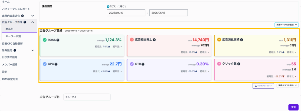 広告グループを作成することで、グループに追加した商品のみの実績を確認できるようになります。