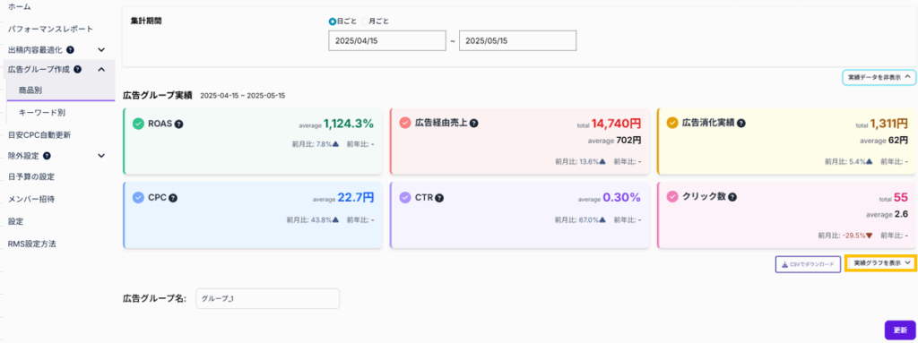 広告グループに登録している商品・キーワードの合計の実績グラフが表示されます。