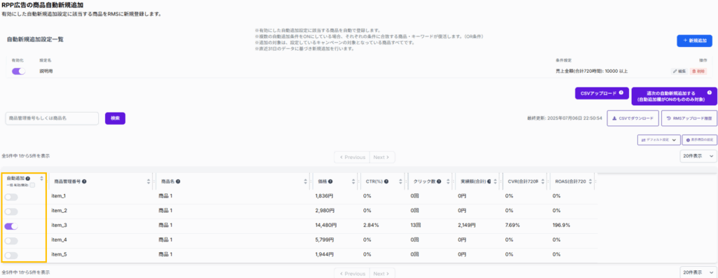 条件に合致したとしても、商品CPCを登録したくない商品は一覧の一番左列にある「自動追加」フラグをOFFにしてください。