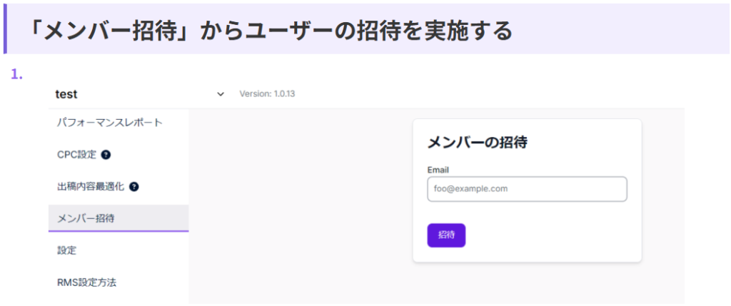 組織を作成したらユーザーを招待できるので、以下画面からユーザーを招待してください。