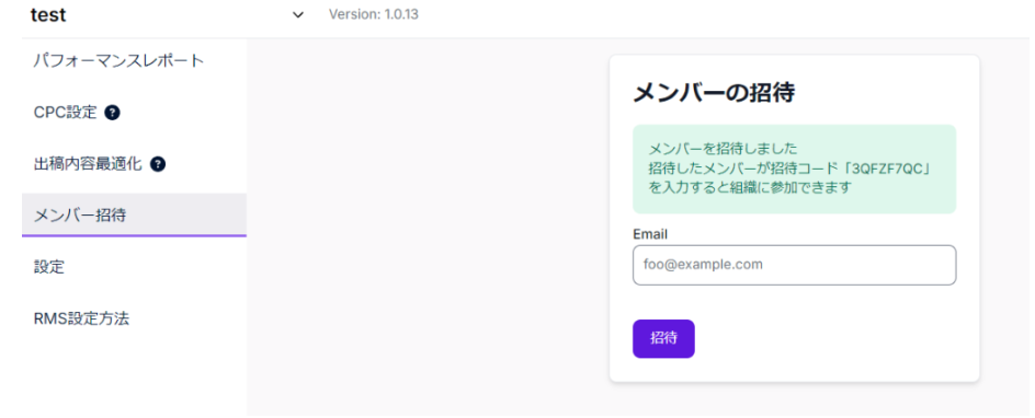 「招待」ボタンをクリックすると、以下画面のように招待コードが表示されるため、招待したメンバーにコードを共有してください。すると、メンバーの招待は完了です。