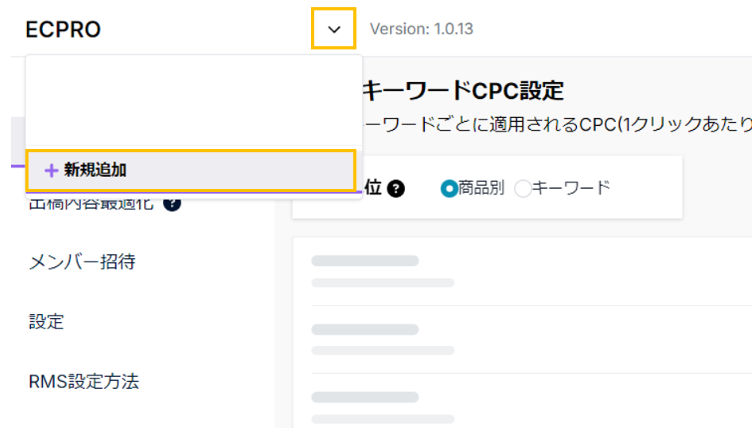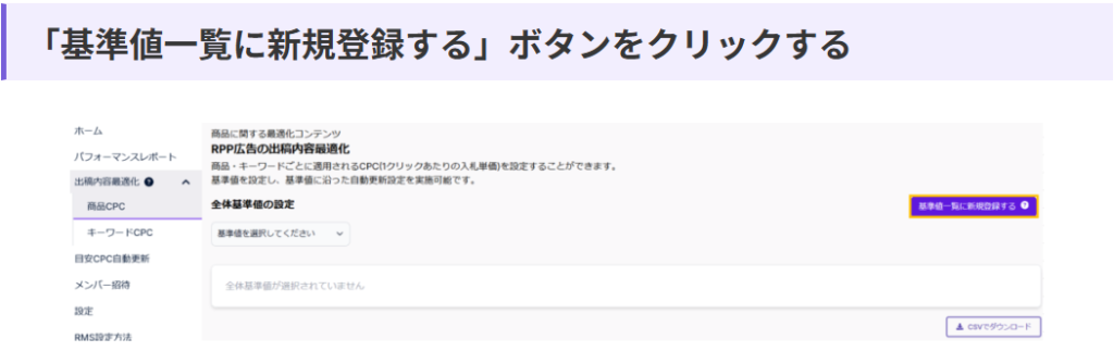まず出稿内容最適化ー商品CPC・キーワードCPCの画面右上にある「基準値一覧に新規登録する」ボタンをクリックし、基準値登録を行います。詳細は以下ページをご確認ください。