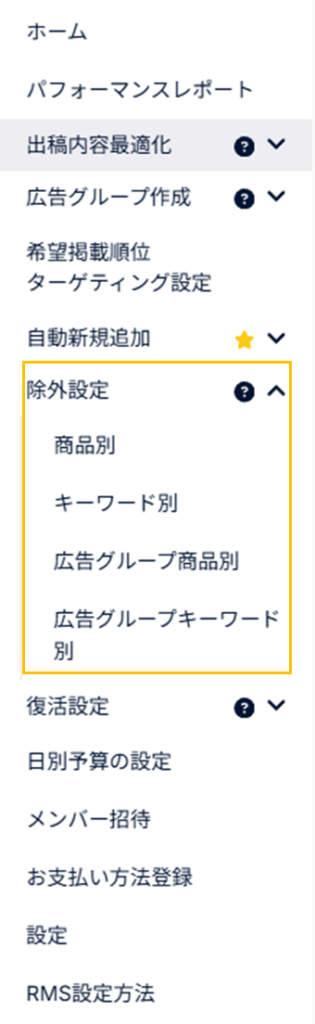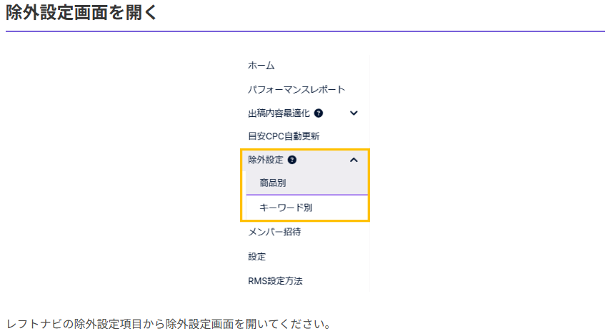 画面左のメニューバーから「除外設定」を開き、「商品別」「キーワード別」のどちらかを選択してください。詳細な設定方法はこちらからご確認ください。