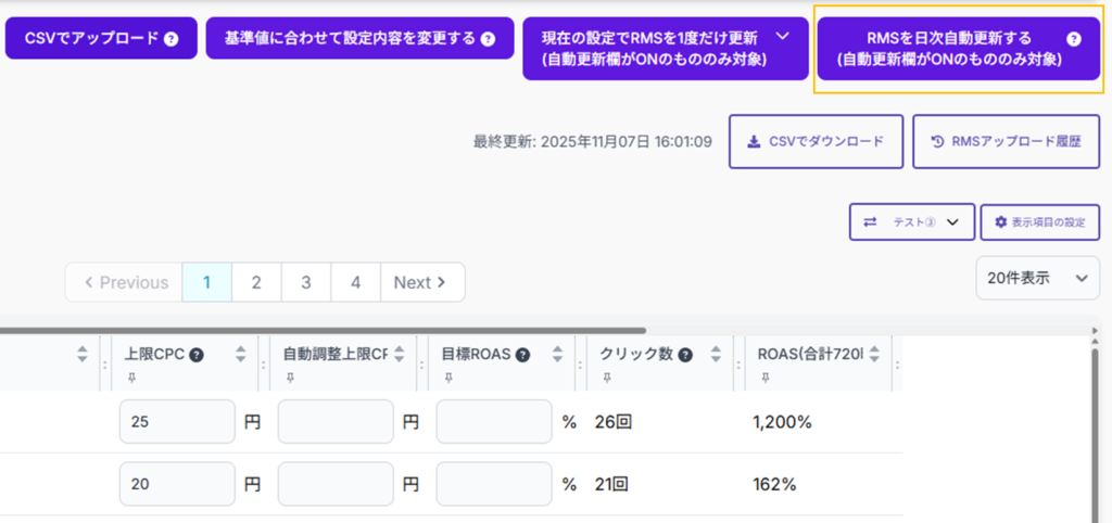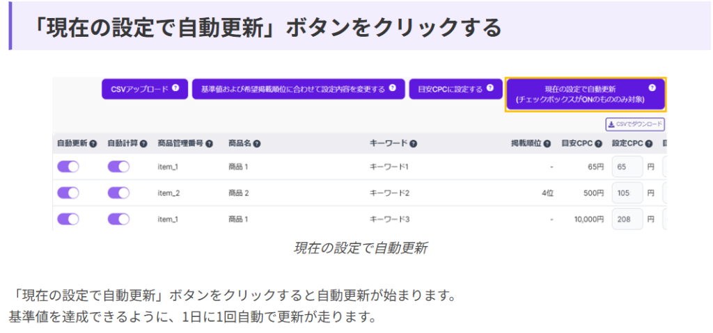 - 「出稿内容最適化ー商品CPC・キーワードCPC」の「RMSを日次自動更新する」ボタンをクリックする