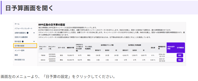 画面左のメニューバーから「日予算の設定>設定」で日予算を設定可能です。1日の予算上限を設定できるため、予算の使い過ぎを防ぐことができます。詳細な設定方法はこちらからご確認ください。