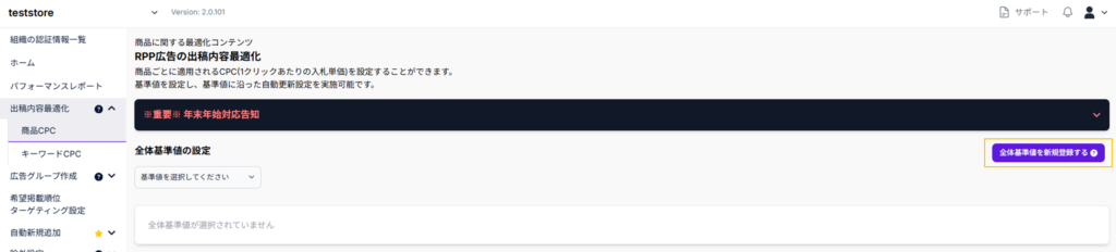 まず出稿内容最適化ー商品CPC・キーワードCPCの画面右上にある「全体基準値を新規登録する」ボタンをクリックし、基準値登録を行います。詳細は以下ページをご確認ください。