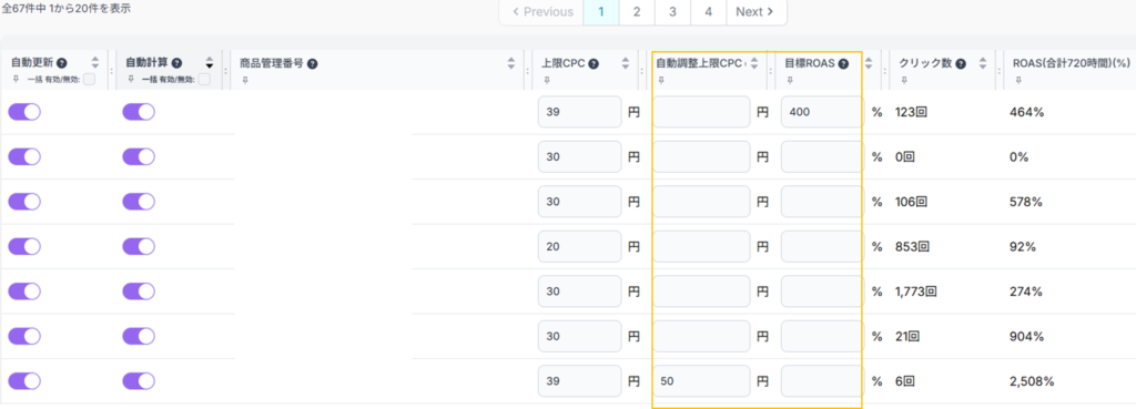 - 自動調整上限CPC:商品CPCをいくらまで引き上げるかを決める機能で、商品ごとに設定することが可能です