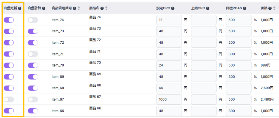商品・キーワード別に目標ROASおよび上限CPC(キーワードCPCの場合は希望掲載順位)を設定することができます。商品やキーワードごとに必要なROASや役割が変わってくると思いますので、それぞれにあった設定をしていただくことが可能です。