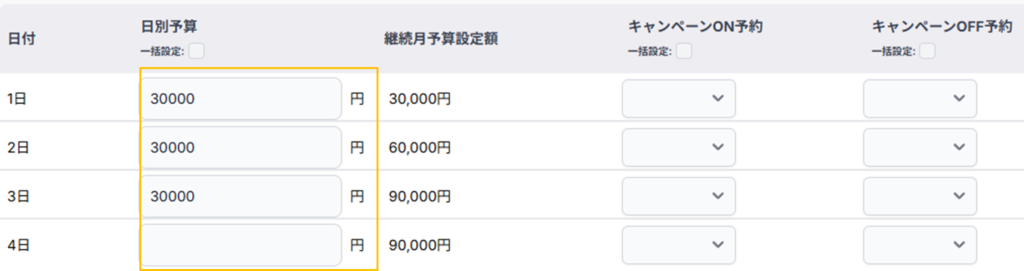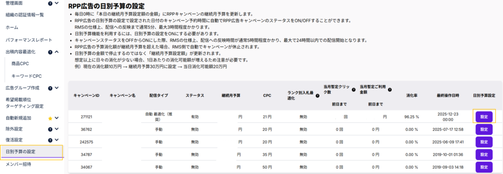 画面左のメニューバー「日別予算の設定>設定」を選択し、日別予算を設定すると、設定した金額で、継続月予算の更新をかけます。