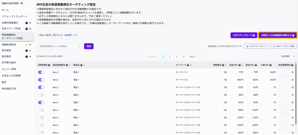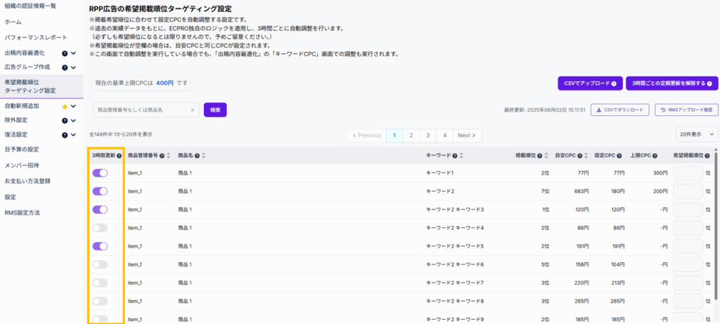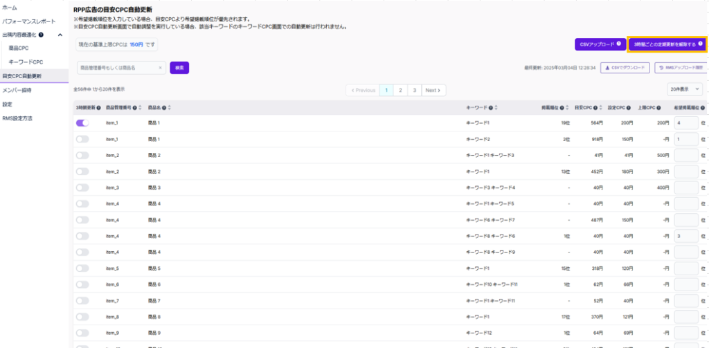 対象キーワードの選定と希望掲載順位の入力が完了したら、「3時間ごとに希望掲載順位に合わせる」ボタンをクリックしてください。3時間ごとに自動でCPC更新が行われます。
