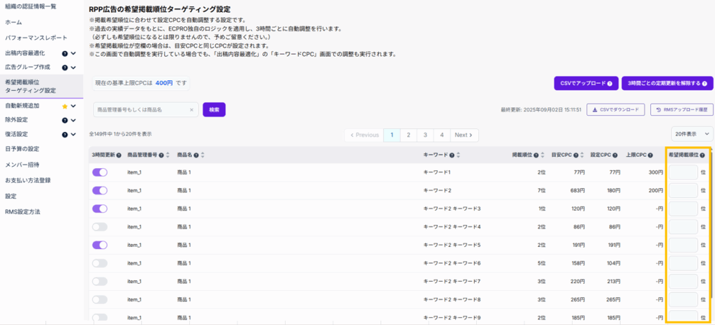 - 「3時間ごとに希望掲載順位に合わせる」ボタンをクリックする