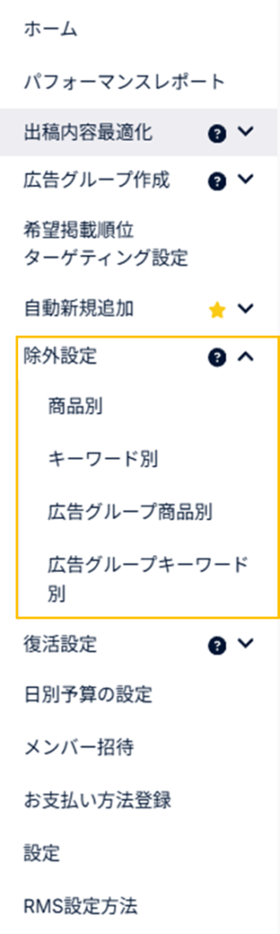 • 複数の条件設定を行う場合、OR条件となります。(それぞれの条件を満たす商品・キーワードを除外します。)