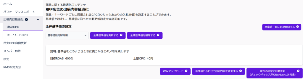 出稿内容最適化画面の基本的な使い方となる「ROAS基準値に合わせて自動更新を行う」運用方法の解説をしていきます。