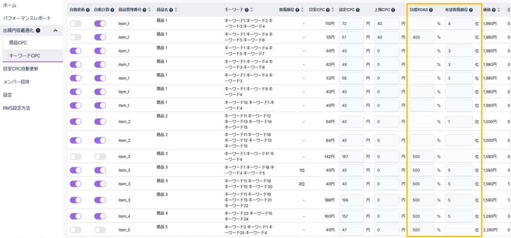 1. キーワード別に「目標ROAS」もしくは「希望掲載順位」を設定する