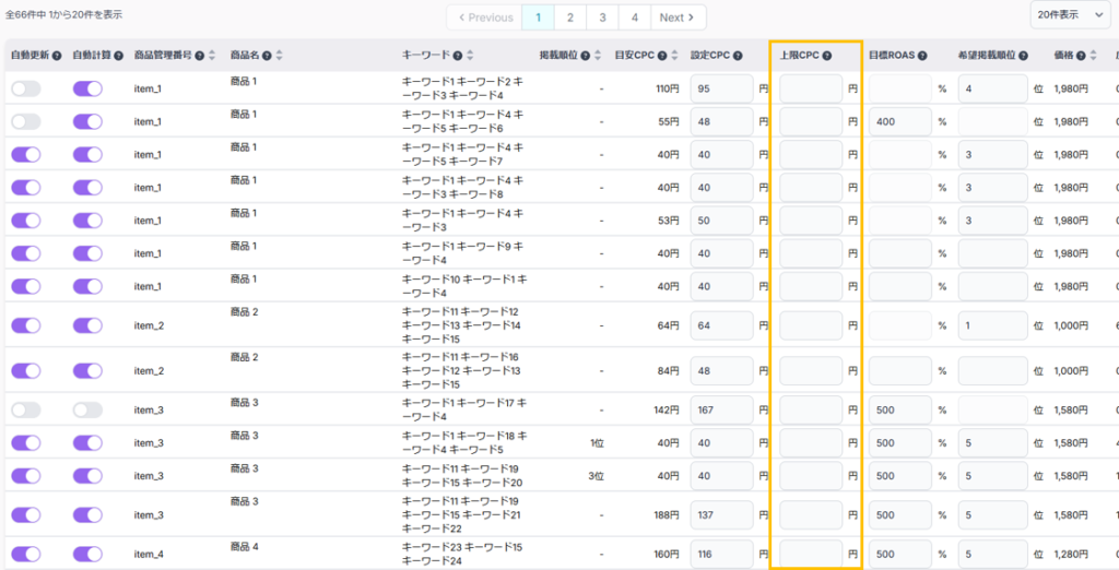 キーワード別に上限CPCを設定することができます。商品やキーワード別に上限となるCPCが異なると思いますので、余力があれば商品別に上限CPCを設定し、コストの最適化を図りましょう。